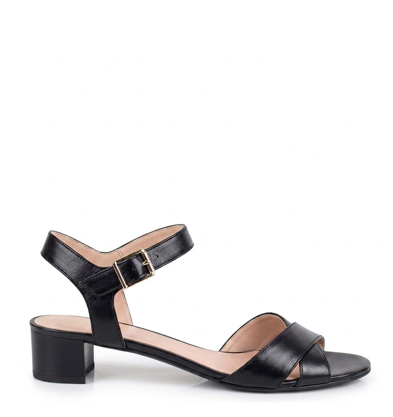 DORA – Czarne sandałki na niskim słupku z odkrytą piętą. Wykonane z licowej skóry. Obcas 3,5 cm (wysokość obcasa jest mierzona dla rozmiaru 37). Wygodne sandałki zapinane na sprzączkę. Tęgość butów to G. Sandałki na niskim obcasie są bardzo wygodne i zapewniają wysoki komfort noszenia w upalne dni.