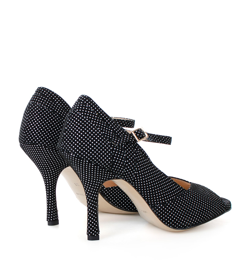 Cholewka wykonana z czarnego materiału w białe kropki to ukłon w stronę kobiecego wdzięku i tanecznej lekkości. To propozycja dla tych, które nie boją się być zauważone – pełna energii, z przymrużeniem oka i odrobiną szaleństwa.