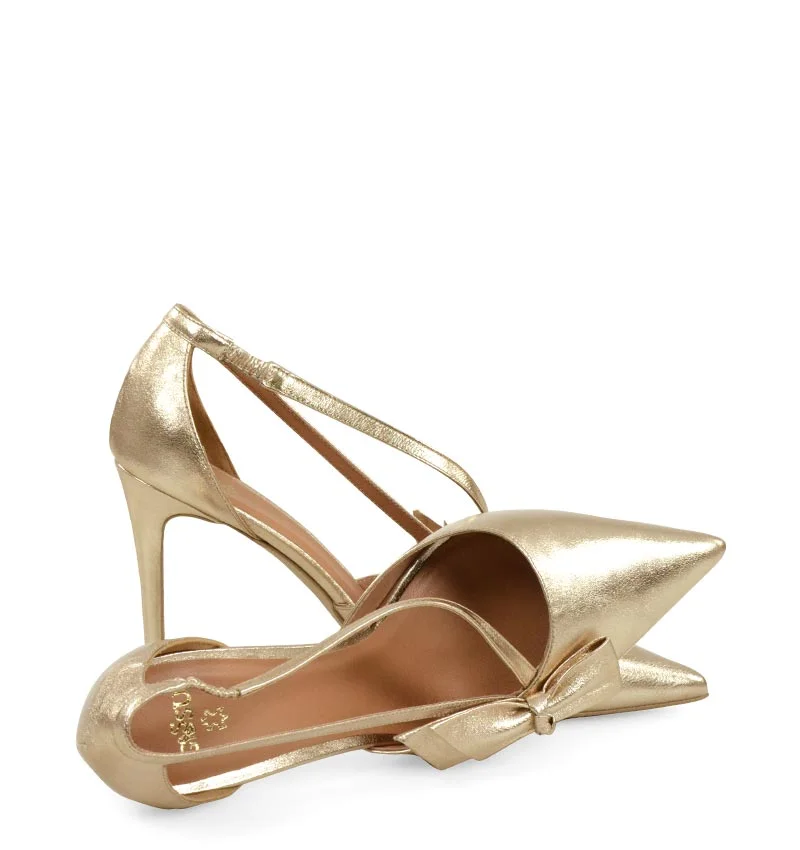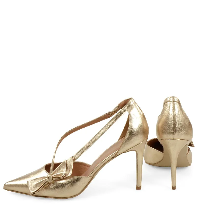 IDA – Złote szpilki na 9 cm słupku (wysokość obcasa jest mierzona w rozmiarze 37). Czubek w szpic lekko wydłużany, wsuwane (pasek z gumką). Buty wykonane z naturalnej skóry licowej układającej się do stopy. Szpilki eleganckie, pięknie prezentują się do sukni ślubnych i balowych. Tęgość butów: F 1/2. Wnętrze butów wykończone delikatną skórą naturalną.