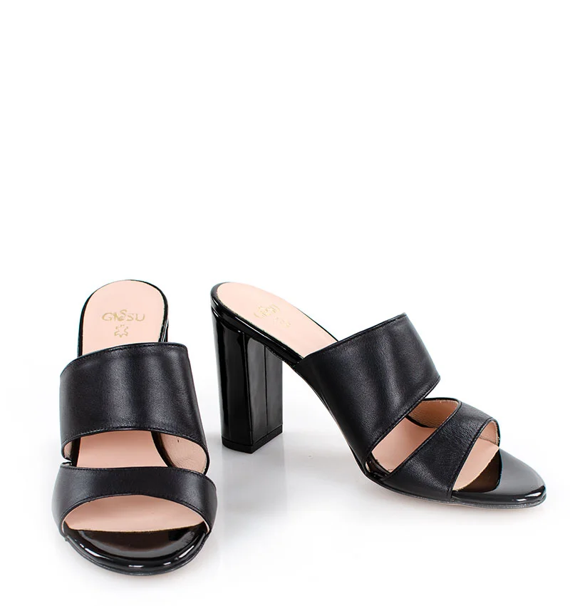 LUNA – Czarne klapki na słupku. Cholewka w postaci dwóch szerokich pasków wykonana ze skóry naturalnej. Wysokość obcasa 9 cm jest mierzona w rozmiarze 37. . Średniej wysokości słupek sprawia, że klapki i wyglądają efektownie. Tęgość butów: F1/2. Wnętrze butów i wkładka wykonane są ze skóry naturalnej.