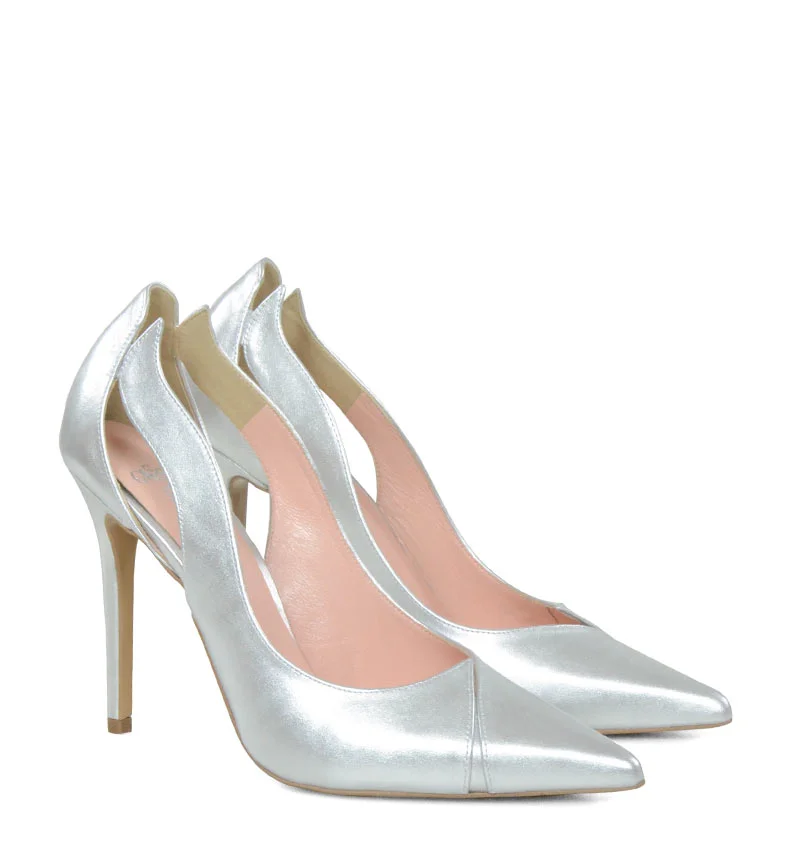 RENI – Srebrne wysokie szpilki z paskiem wokół kostki. Szpilki mają dyskretne wycięcia po bokach pięty w kształcie płomyków. Wysokość obcasa 11 cm jest mierzona w rozmiarze 37. Cholewka wykonana z naturalnej skóry licowej. Wysoka szpilka sprawia, że szpilki wyglądają efektownie. Tęgość butów: F1/2. Wnętrze butów i wkładka wykonane są ze skóry naturalnej.