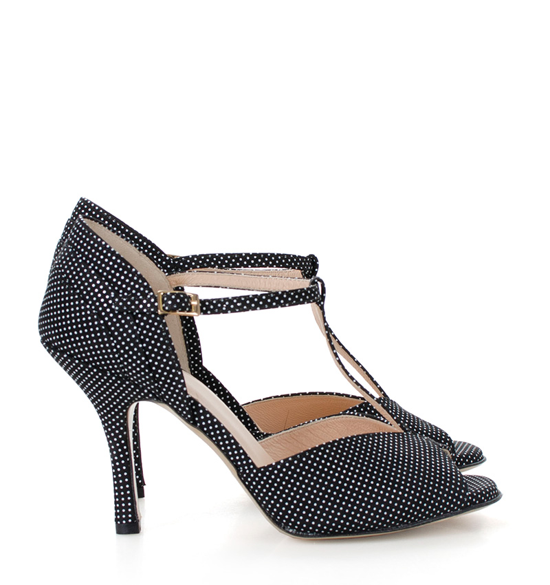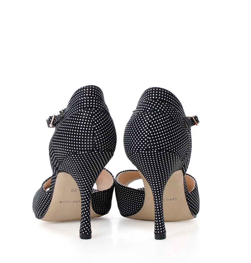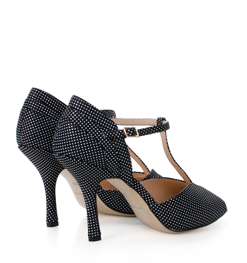 Czarne tło przełamane drobnymi białymi kropeczkami tworzy unikatowy efekt, przyciągający spojrzenia bez przesadnej ekstrawagancji. To model, który świetnie dopełni zarówno klasyczne, jak i odważniejsze taneczne stylizacje.